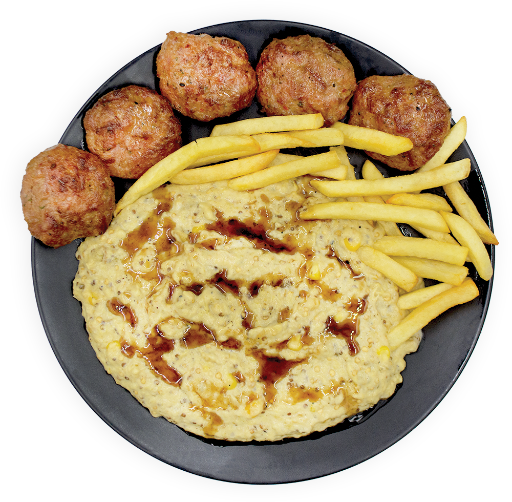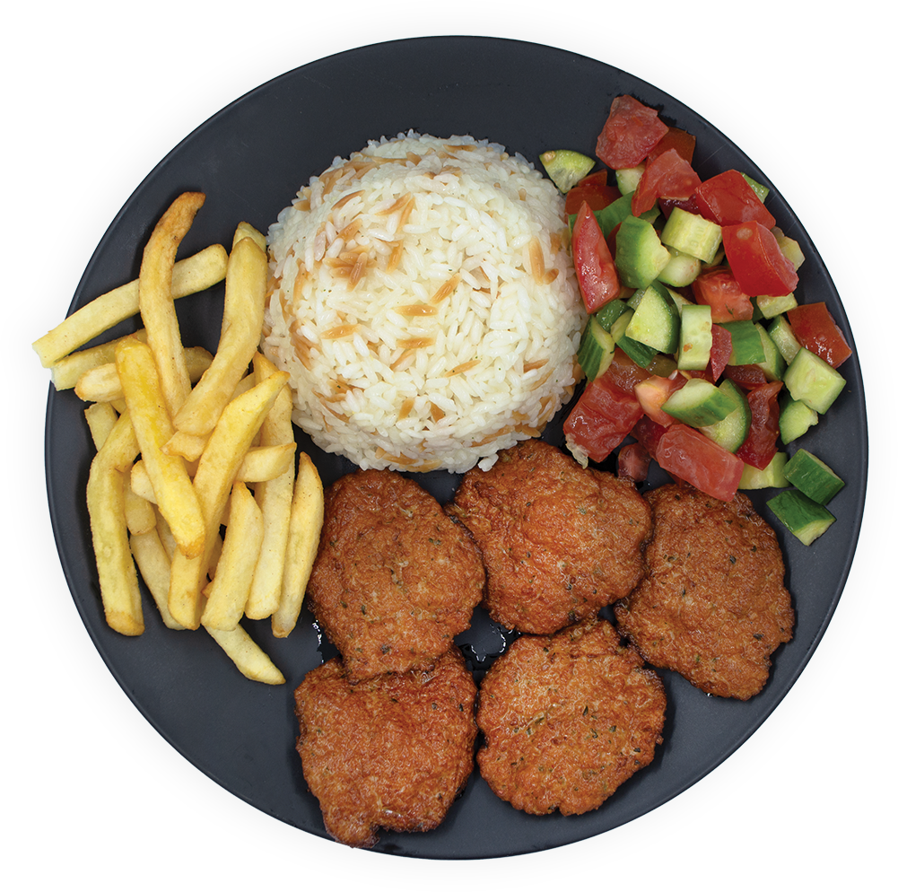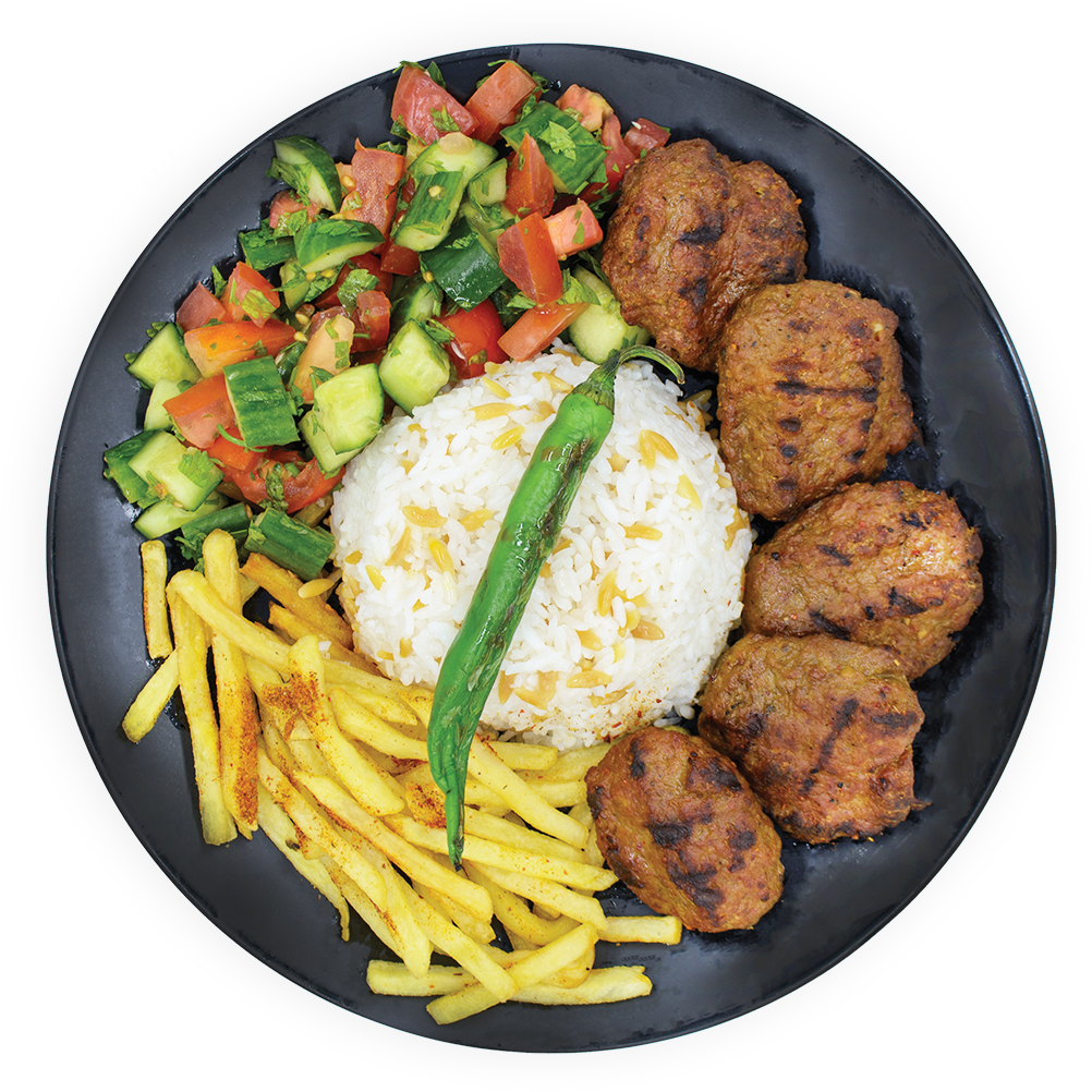 5 pieces of meat kofta grilled on the charcoal with our special spices . Served with Turkish rice, fries and salad