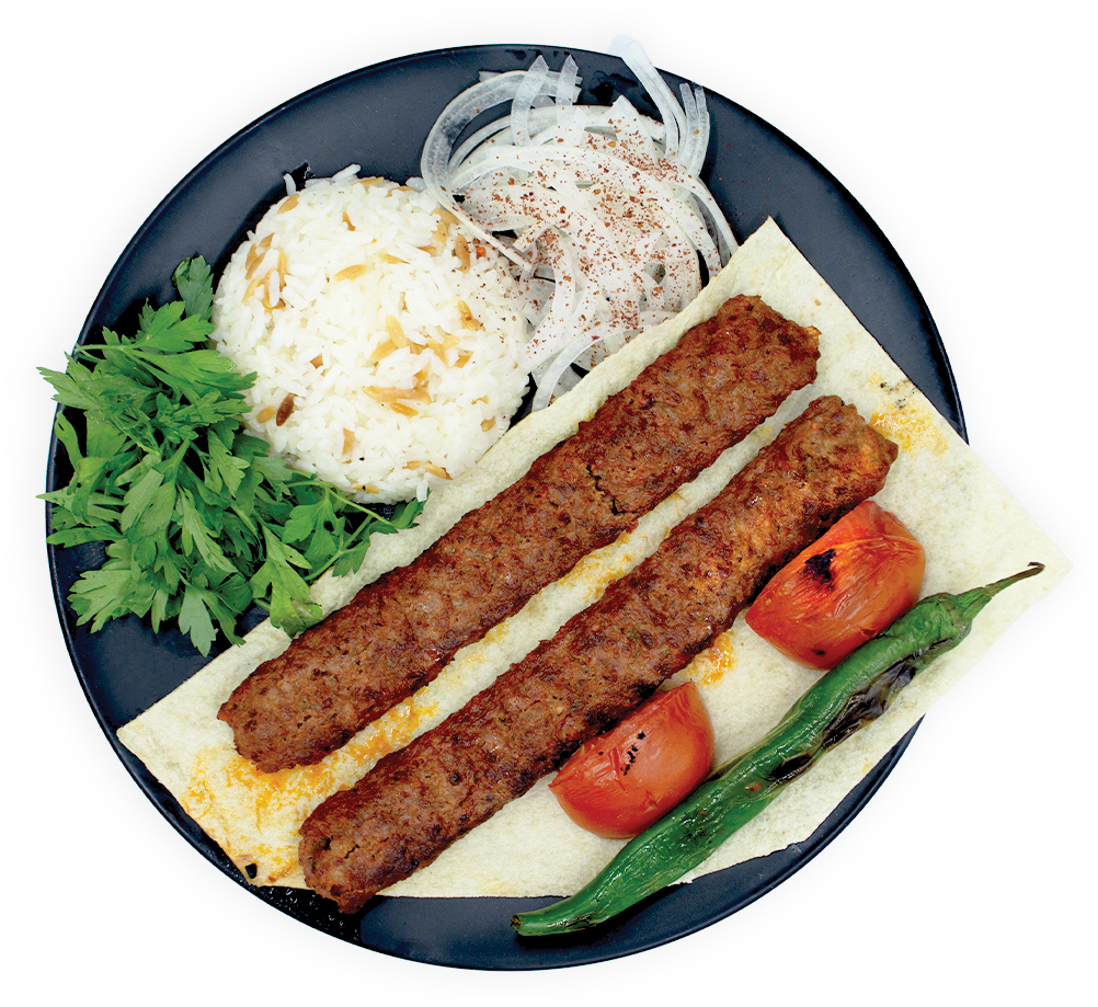 A fresh meat kabab marinated with fresh hot peppers, tomatoes and garlic grilled on the charcoal services with Turkish rice and bread