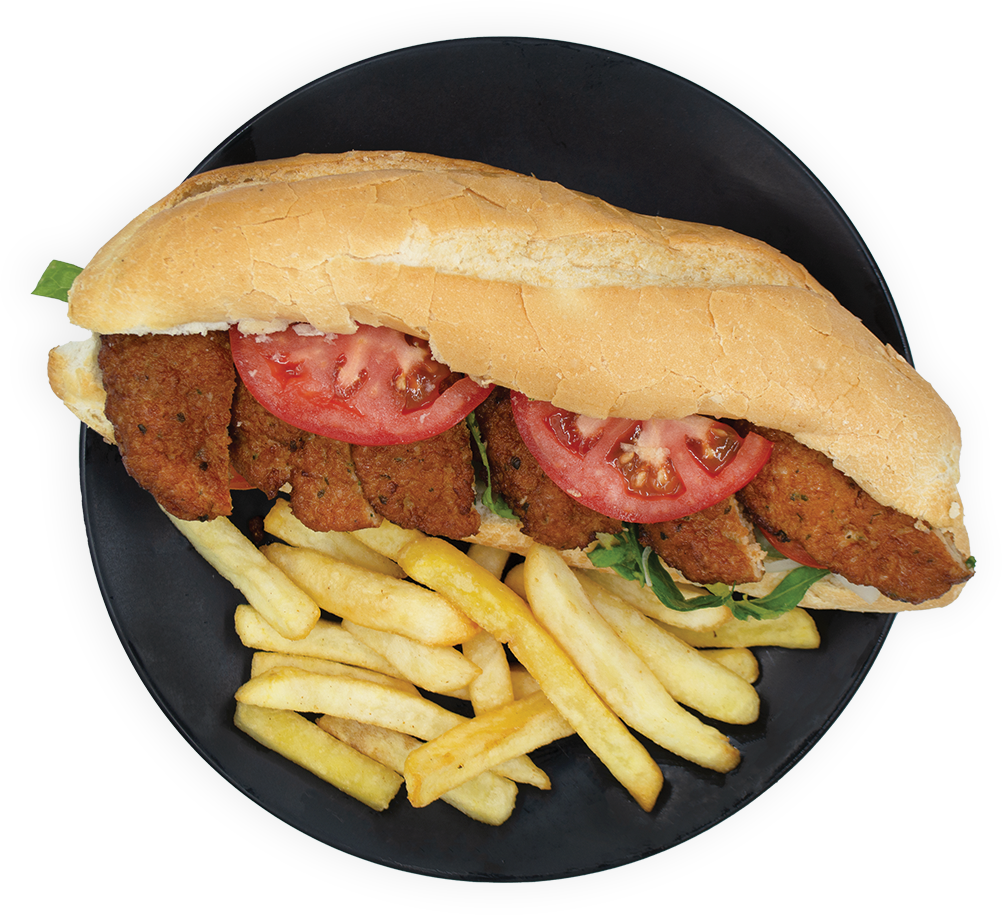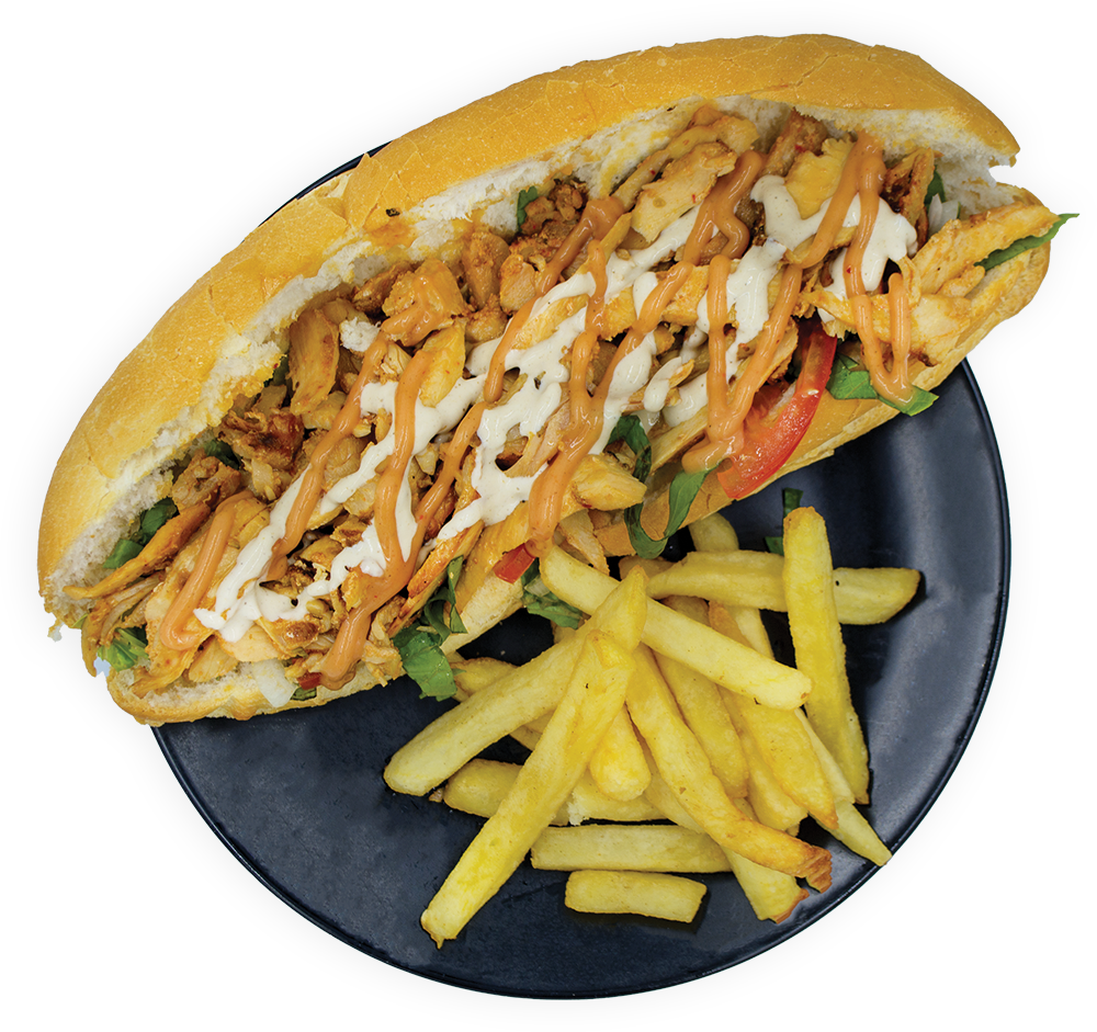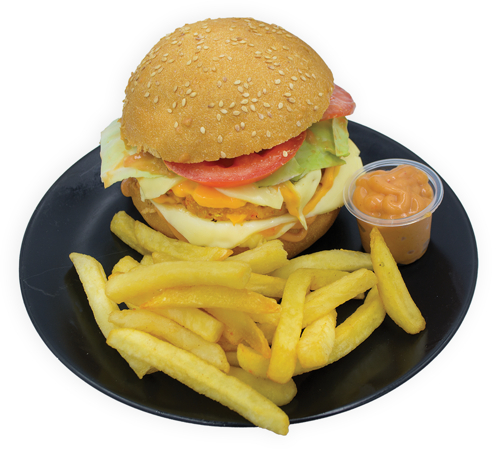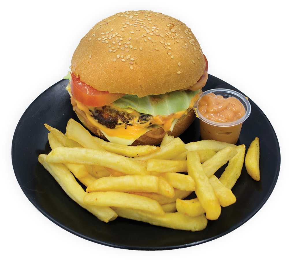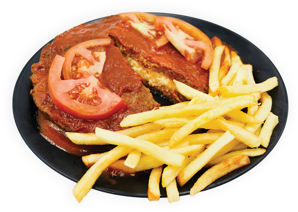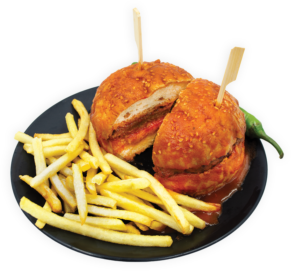 A meat burger grilled on charcoal drenched in our special tomato sauce. Served with fries and pickles.