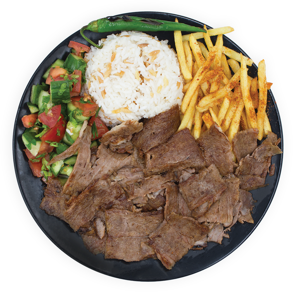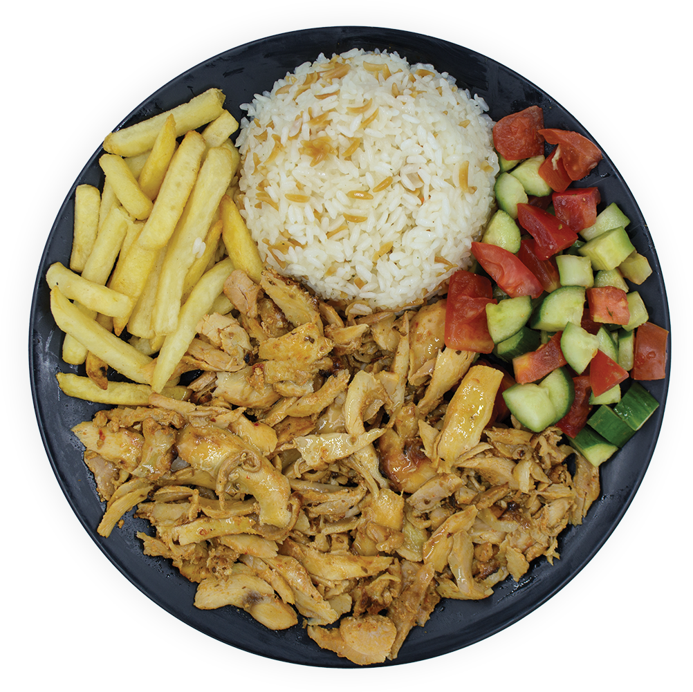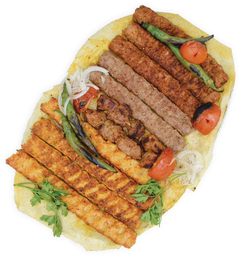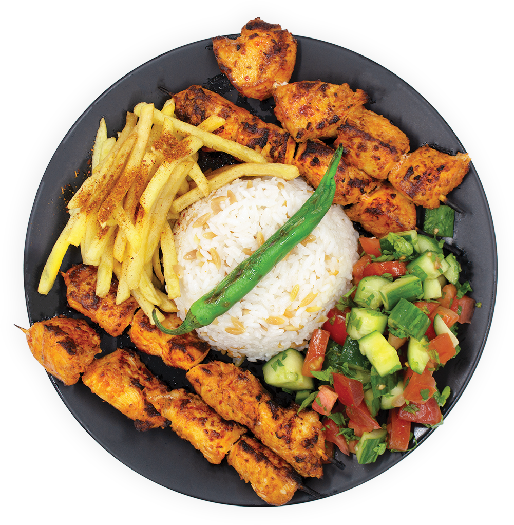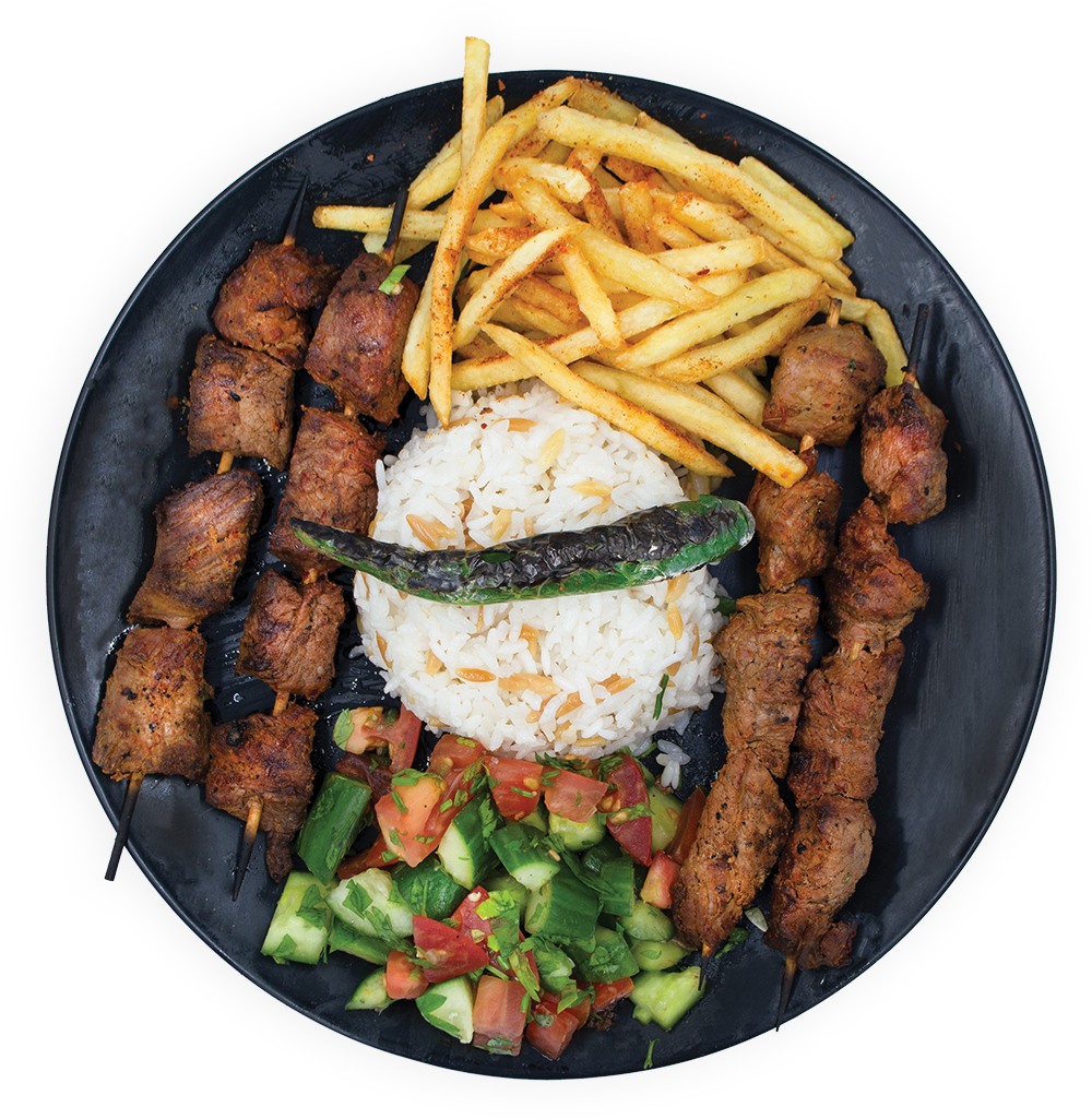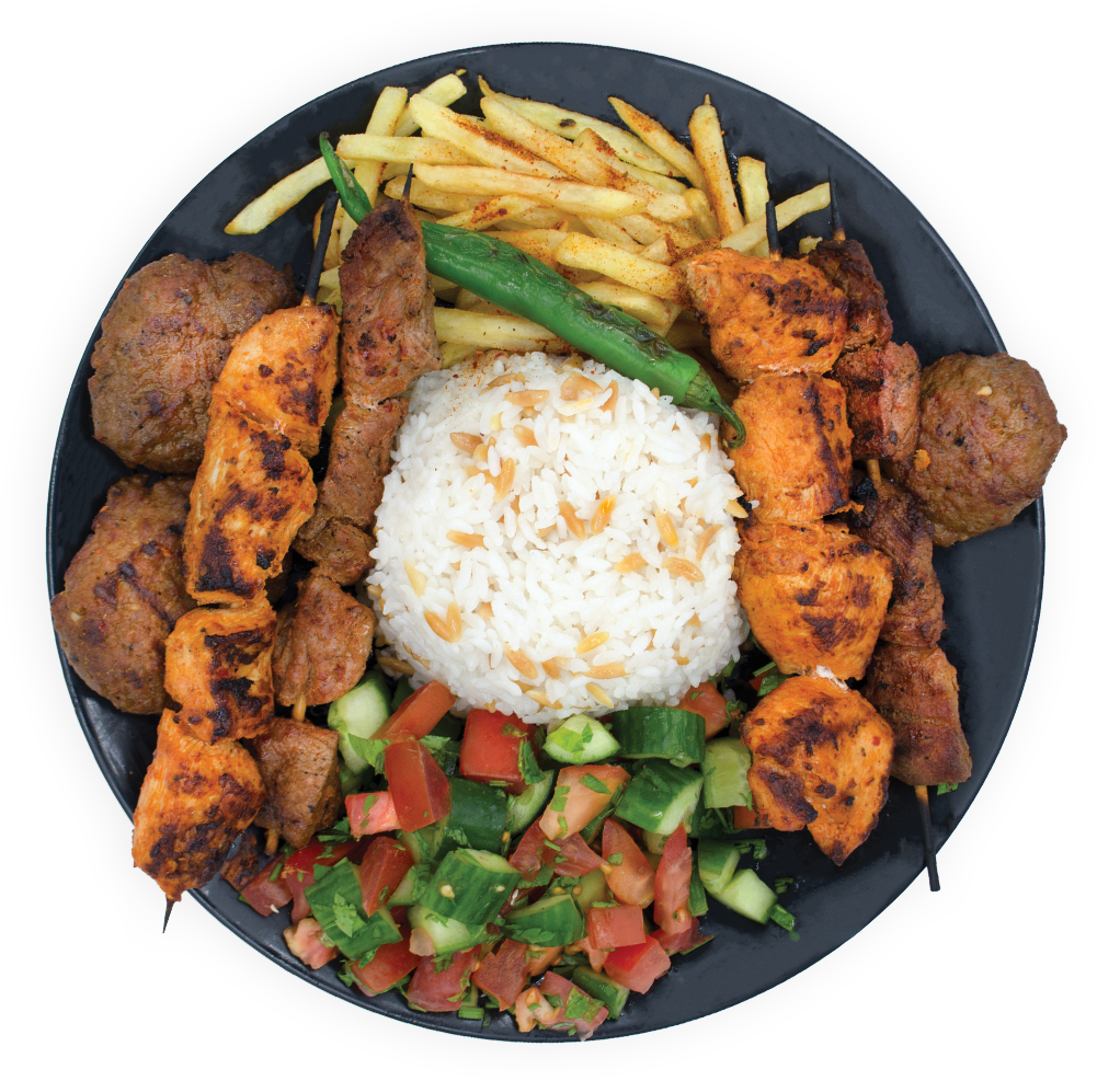 2 beef skewers, 2 shish tawook, 3 pieces grilled kofta served with Turkish rice, fries, vegetable salad, garlic and raita sauce.