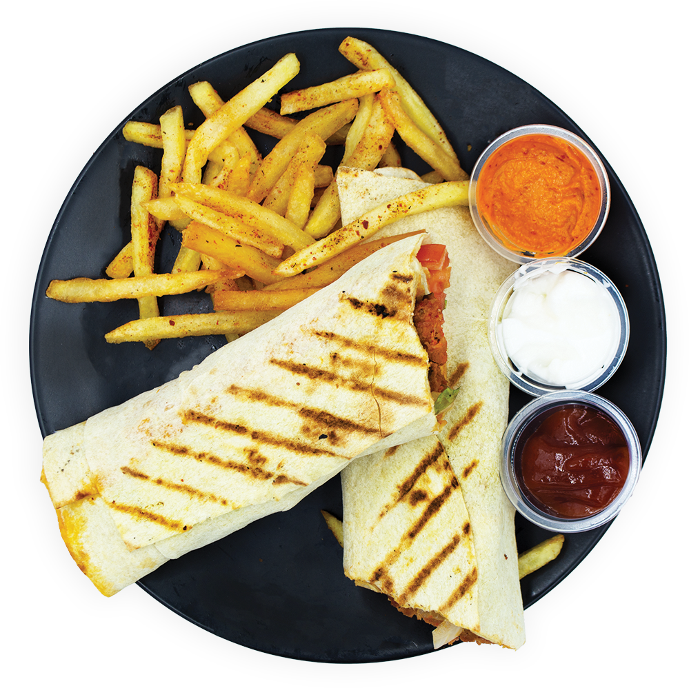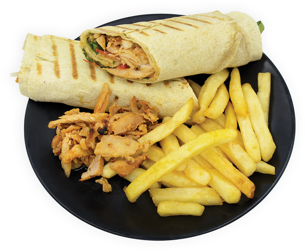 A juicy and tasty chicken kofta grilled on the charcoal with tomato, lettuce, pickles and served with fries and soft drink
