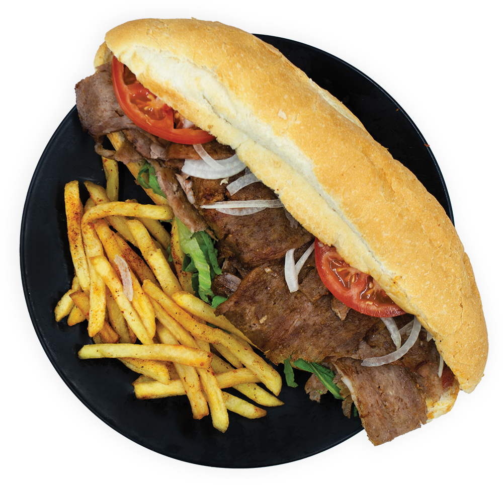 Doner slices, tomato, lettuce, pickles and fries served potatoes fingers and soft drinks.