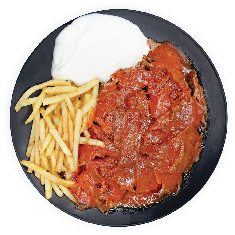 Meat doner slices served on chopped Turkish pide bread and topped with special tomato sauce and butter dressing and a side-serving of yoghurt.