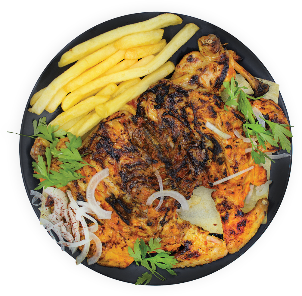 Full chicken grilled on charcoal served with fries and garlic sauce.