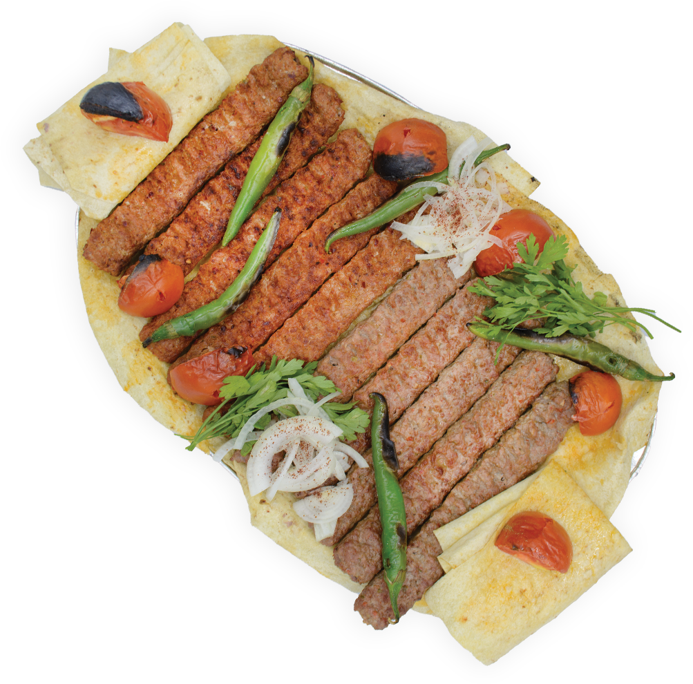 A fresh daily meat of Turkish adana & urfa kebab serves with grill tomatoes, peppers and biwaz and lentils soup.