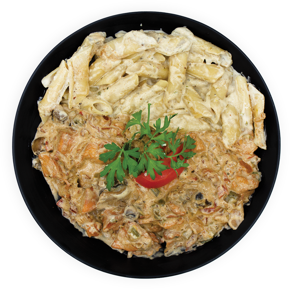 Well marinated chicken strips in creamy sauce sautéed with mushrooms, capsicum & tomatoes. Served with creamy penne pasta and salad.