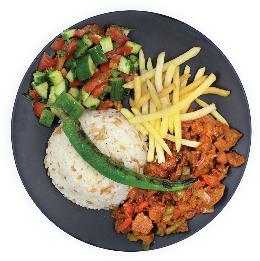 Beef cubes sautéed with onion, red and green capsicum. Served with Turkish rice, fries and salad.