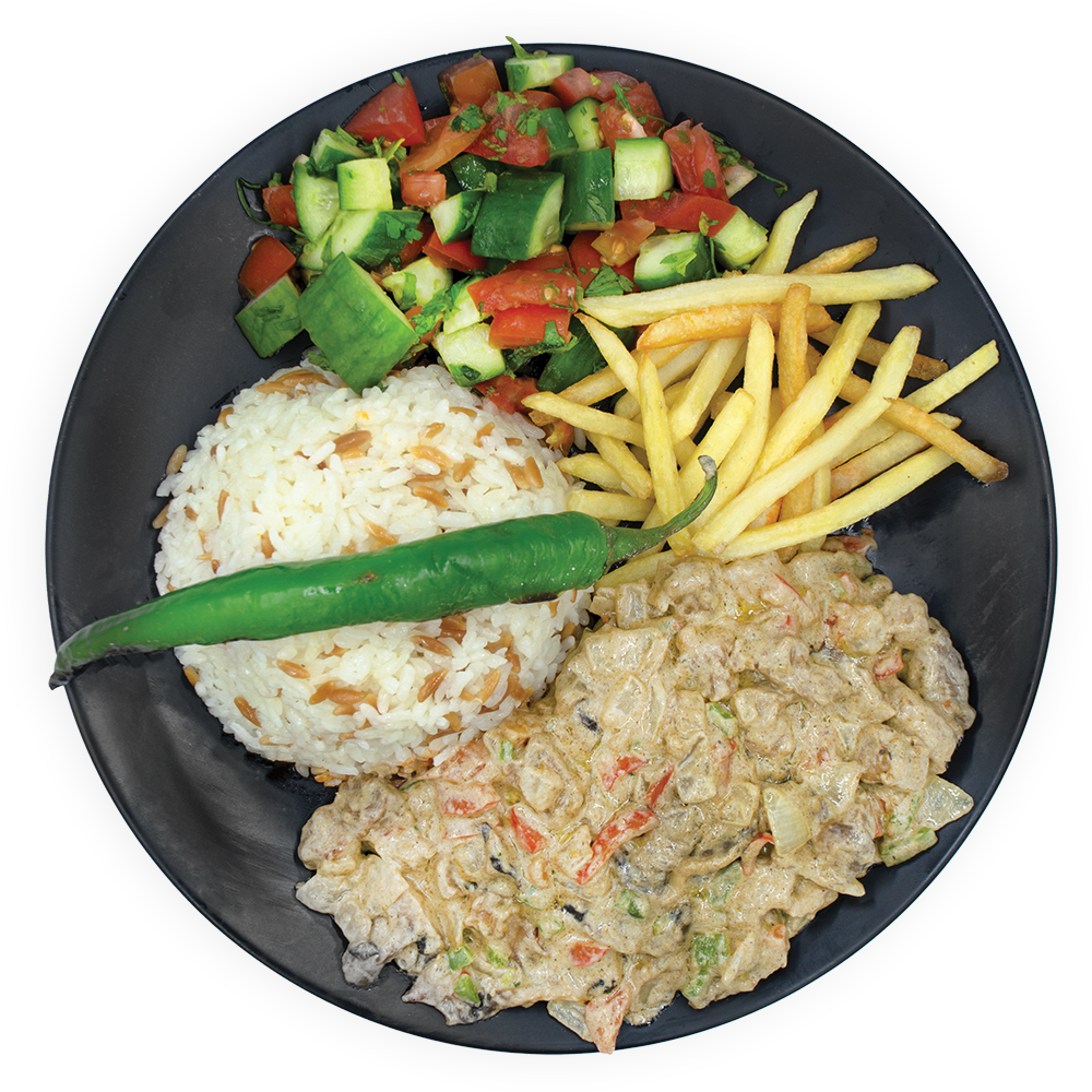 Beef cubes sauteed in a special creamy sauce with mushroom and cherry tomatoes. Served with Turkish rice, fires and salad.