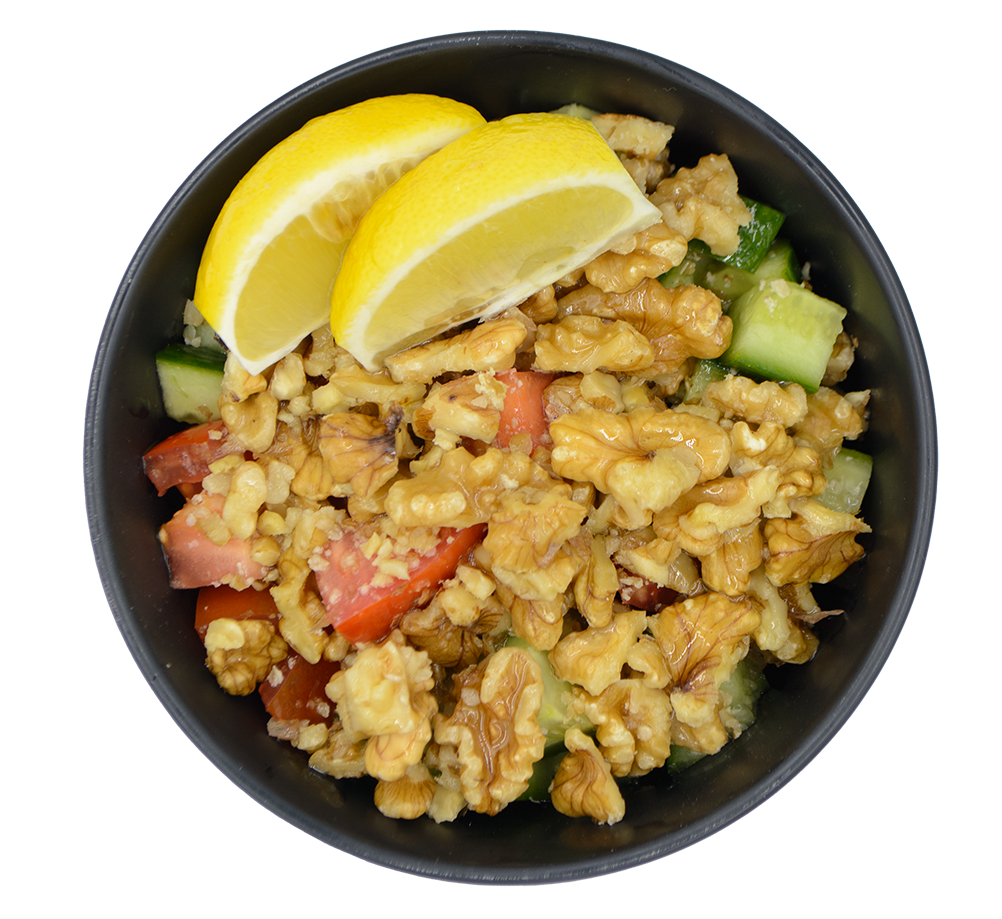 Chopped tomatoes, cucumber and parsley topped with premium walnuts and dressed with olive oil and pomegranate sauce.