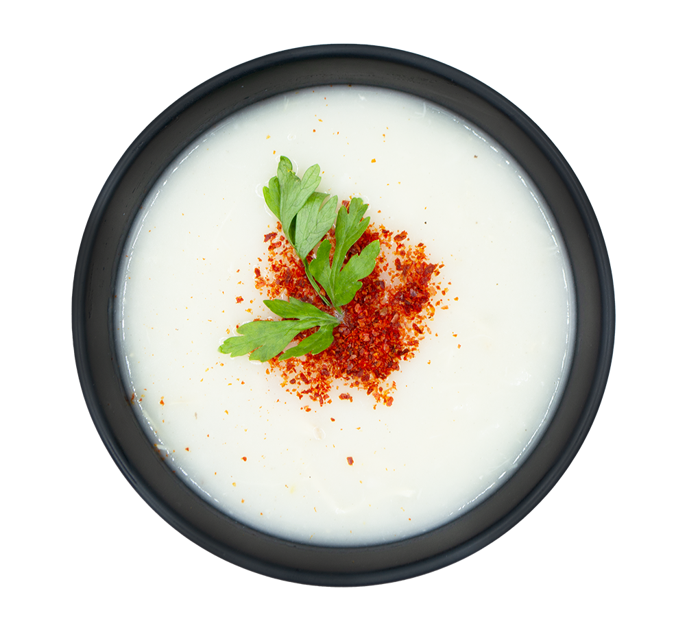 Meat doner slices served on chopped Turkish pide bread and topped with special tomato sauce and butter dressing and a side-serving of yoghurt.